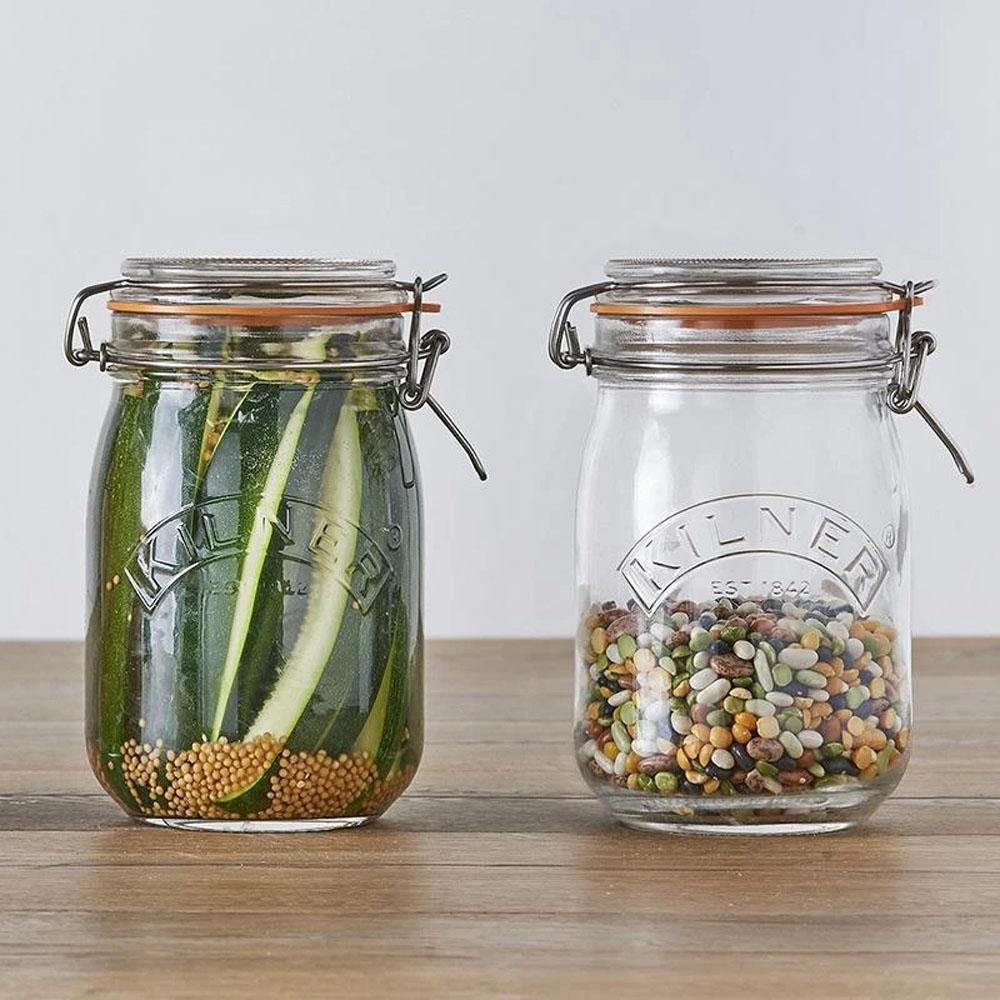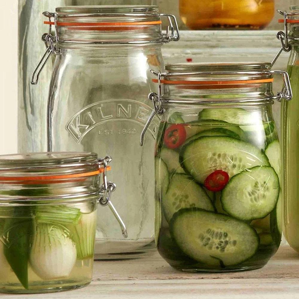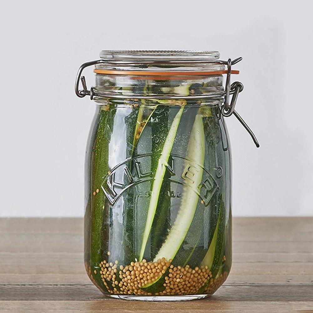 El Frasco de diseño Kilner redondo con Cierre Clip 1 Litro Kilner es la forma más linda y práctica de conservar gran variedad de alimentos. Su abertura de cuello ancho hace que sea muy fácil introducir frutas, verduras, salsas, frutos secos, etc y dar sabor a las bebidas. Es transparente para hacer visible su contenido. Este frasco cuenta con cierre clip top y con una banda de silicona de color naranjo que permite un sello a prueba de aire.