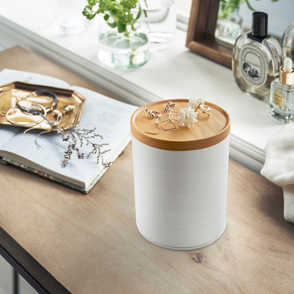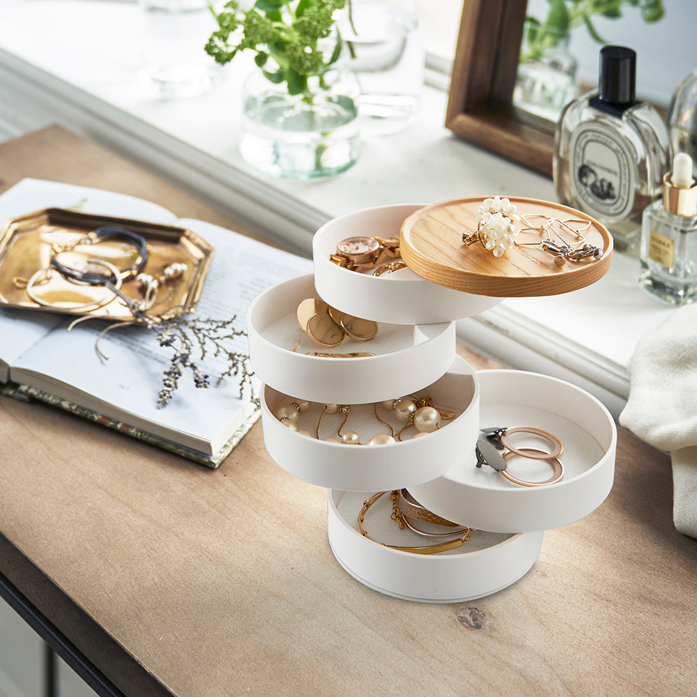 Esta caja de accesorios cuenta con cinco bandejas y una tapa de madera, ofreciendo una forma elegante de mantener sus joyas y accesorios perfectamente organizados. Las bandejas giran fácilmente para un acceso rápido y crean una presentación elegante y ordenada.Compacta, con estilo y perfecta para sus tesoros, guarde todos sus accesorios en esta bella caja organizadora. Clasifique sus aros, pulseras y collares como desee entre los cinco niveles. Extiéndalos para que sus adornos brillen y resplandezcan, y cierre la tapa de madera para protegerlos del polvo y no se enreden.
