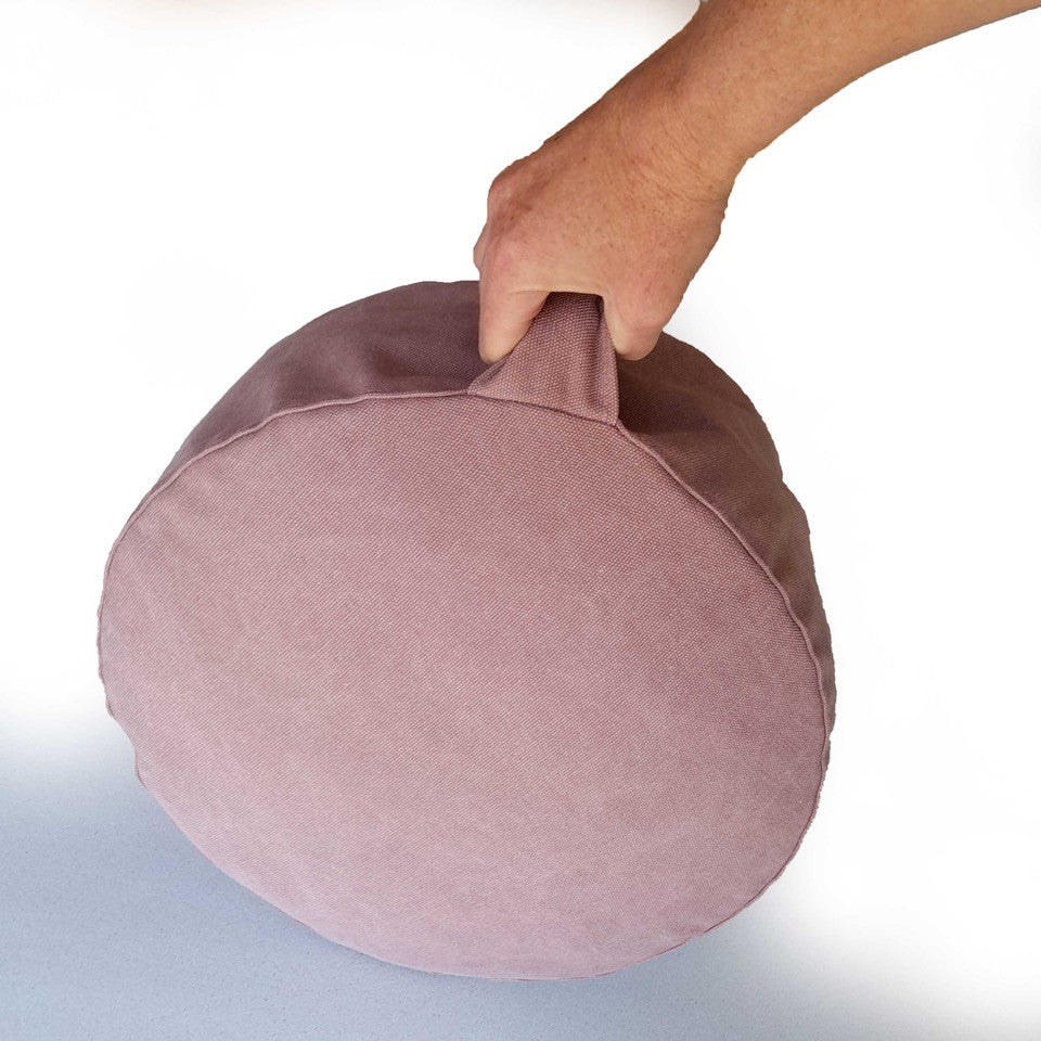 Cojín rellenado con cascarilla de arroz. Ideal para ejercicios de meditación o yoga. La funda exterior es de 100% algodón con manilla para facilitar transportarlo. El cojín interior viene con cierre para sacar del relleno si fuese necesario y así adaptar la altura del cojin a tu gusto.