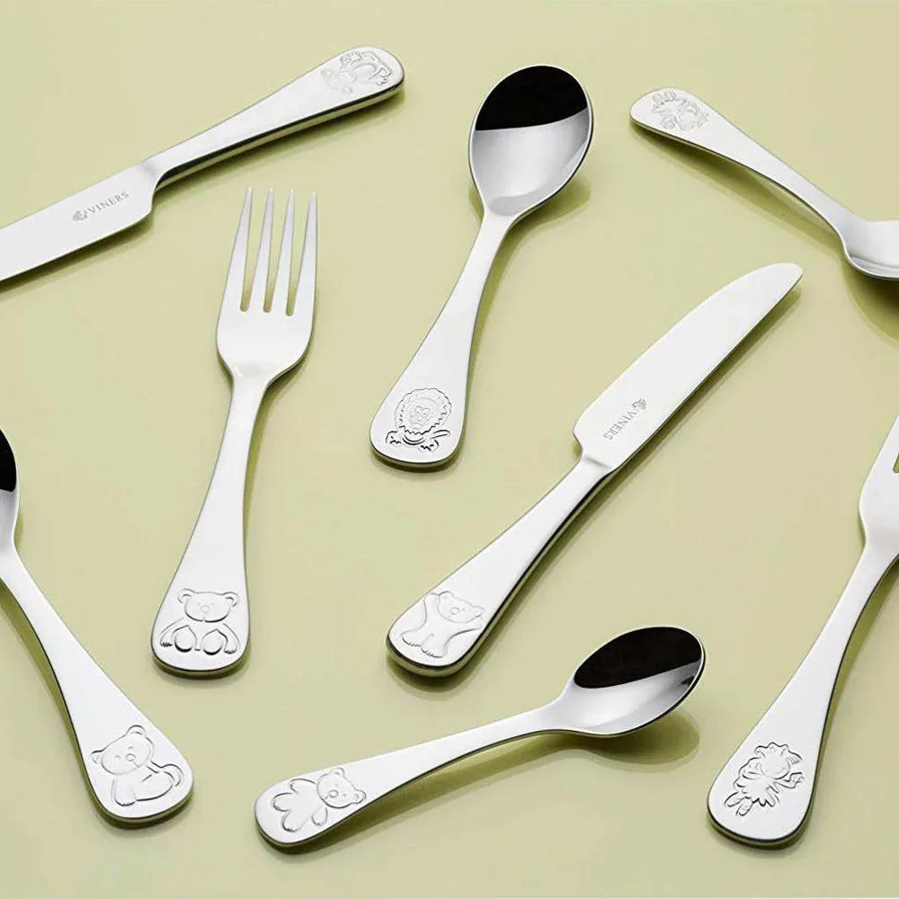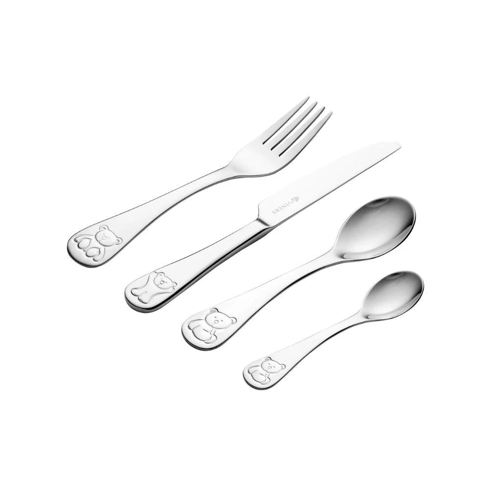 Este juego de cubiertos infantiles es todo lo que necesitas para que la hora de comer sea divertida y emocionante para tu pequeño. Con sus adorables mangos contorneados con relieve de oso y bordes suaves, está diseñado y fabricado pensando en las manitos y bocas de los más pequeños.Este juego de cubiertos Viners de 4 piezas es perfecto para los niños a medida que crecen y aprenden a comer de forma independiente. Incluye un cuchillo de mesa, un tenedor de mesa, una cuchara de postre y una cucharita de té, todo ello en una adorable caja de regalo con temática de oso.Hecho de acero inoxidable 18/0 pulido a espejo, pensando en la seguridad de los niños, este juego de larga duración es resistente a la corrosión y apto para lavavajillas. El cuchillo tiene un dentado ligero pero seguro que permite a los niños cortar su propia comida sin sufrir daños.