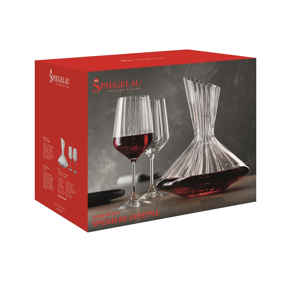 Un set de Regalo muy elegante de la marca Alemana Spiegelau. El juego consta de un decantador y dos copas de vino tinto. El conjunto pertenece a la línea Lifestyle y tiene una estructura de ondas suaves con un gran efecto óptico. Lifestyle es una serie que combina lo moderno con el "Zeitgeist" y garantiza una cena con estilo. El decantador es adecuado para 750 ml de vino y tiene capacidad máxima de 2,9 litros.