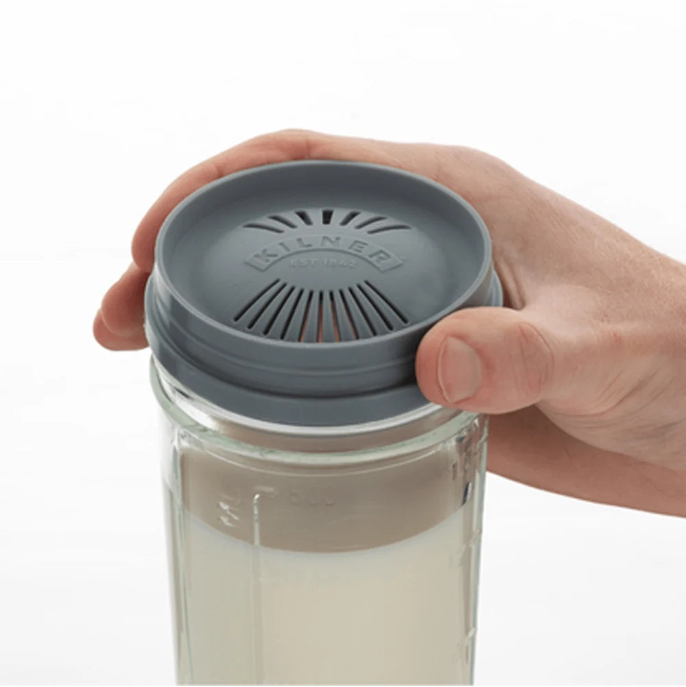 Haga su propio kéfir saludable con el set de kéfir Kilner® . Simplemente agregue granos de kéfir al frasco usando la exclusiva cuchara medidora de madera de haya y luego agregue leche o agua azucarada para permitir que comience la fermentación. Cree bebidas probióticas con sabores picantes para consumir de inmediato o incorporarlas a recetas de comidas saludables y equilibradas.Este set único tiene una tapa coladora de silicona de doble tamaño con una tapa de acero inoxidable para cubrir el frasco una vez que se completa el proceso de fermentación.Viene en una bella caja de regalo a todo color que incluye una receta y un folleto de instrucciones paso a paso, lo que lo convierte en un regalo ideal.